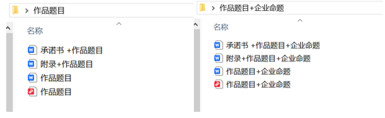 企业命题团队将调查报告(WPS 或 WORD 文档、PDF 版),附录,参赛承诺书放入一个文件夹(不压缩),文件夹命名方式: 作品题目+企业命题。文件夹含4个文档:作品题目+企业命题(WPS 或 WORD 文档),作品题目+企业命题(PDF 版),附录+作品题目+企业命题,承诺书+作品题目+企业命题。